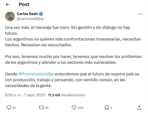 Tras las elecciones de legisladores provinciales en Buenos Aires, el gobernador de Jujuy, Carlos Sadir, se expresó en su cuenta de la red social X (antes tweeter), afirmando que “Una vez más, el mensaje fue claro: Sin gestión y sin diálogo no hay futuro”.