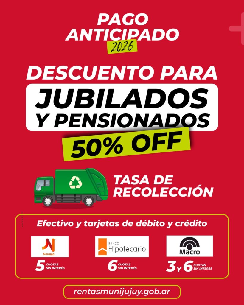 La Municipalidad de San Salvador de Jujuy, a través de la Dirección de Rentas, recuerda a los vecinos que siguen vigentes los importantes beneficios del programa de Pago Anticipado 2026, una oportunidad para ahorrar en impuestos y tasas municipales hasta el 31 de marzo.