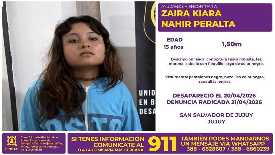 El Comité Interinstitucional de Actuación en Casos de Desaparición de Mujeres, Niñas y Personas de la Diversidad (CINDAC), informa que se busca a KIARA ZAIRA NAHIR PERALTA de 15 años. Se encuentra desaparecida desde el 20/04/26, la denuncia fue radicada el 21/04/26 con domicilio en San Salvador de Jujuy.
