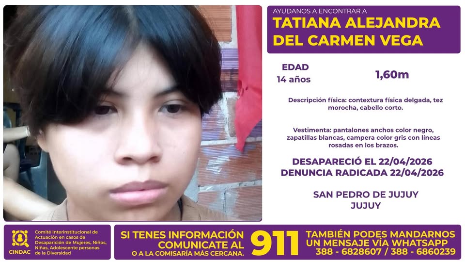 CARMEN VEGA de 14 años. Se encuentra desaparecida desde el 22/04/26, la denuncia fue radicada el 22/04/26 con domicilio en San Pedro de Jujuy.